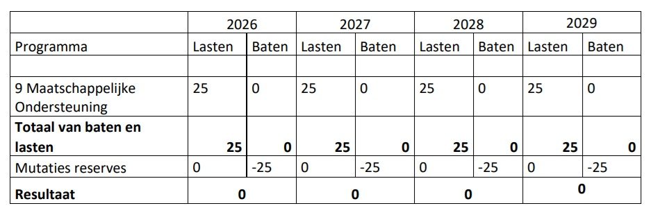 - Daarom het budget van programma 9 Maatschappelijke Ondersteuning vanaf 2026 structureel te verhogen met € 25.000;